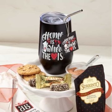 Treat your recipient to a unique and memorable Housewarming gift. This gift set includes a “Home Is Where The Heart Is” steel mug and a stainless steel straw set. This cute mug is filled with gourmet hot cocoa mix, chocolate-covered delights, and many more delicious treats.