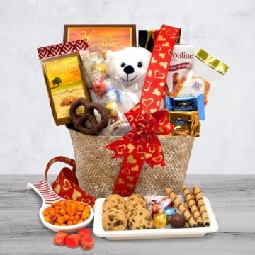 This adorable and cute gift basket comes with a teddy bear and ribbon that pretty much makes your message clear. When trying showing someone how much you love them, choose this "love"able gift basket.