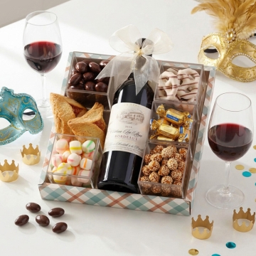 Celebrate Purim with a refined touch. The Limited Edition Purim Wine Tray pairs a bottle of Chateau Les Riganes wine with a festive assortment of chocolate covered peanuts, fruit-filled hamantaschen, vanilla coated pretzels, buttery caramels, fruit puffs, and sesame toasted peanuts, all beautifully arranged for effortless gifting.