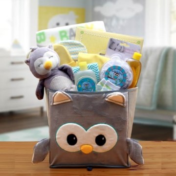 Welcome the new tiny "hoot" home with our adorable Little Hoot Baby gift set. The ultra-plush owl will soon become the new little bundle's most treasured friend. He even has a stroller hook so he'll never be lost. This gift is done in neutral yellows and teals so it may be used for a girl or a boy. We've used a collapsible owl storage bin as the container to hold all his favorite toys as the years go by.