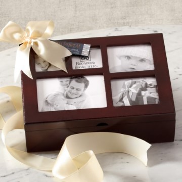 A Purim gift arrangement ensconced in a mahogany photo box.