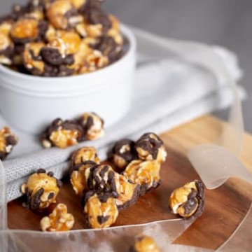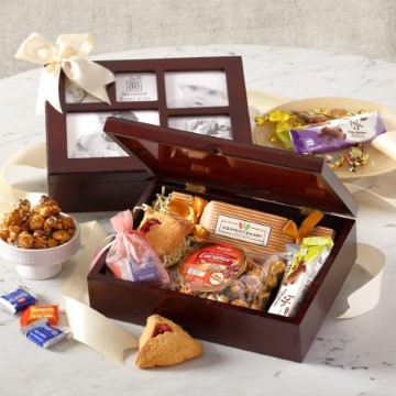 A gift arrangement ensconced in a mahogany photo box.