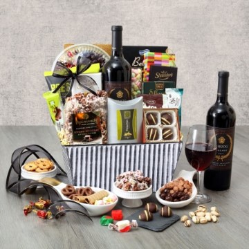Uncover this extravagant gift basket. This gift basket is filled with a collection of delectable delights including a Herzog Lineage Cabernet wine, gourmet popcorn, luscious chocolate truffles, and more!