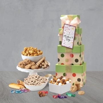 Pop the cork! It's time to celebrate! You may feel like dancing when you see the fun and lively designs on our Gourmet Celebration Gift Tower. Their energy makes us want to move! Your gift recipient will love getting these sweet and savory treats in the adorable stacked gift box set.