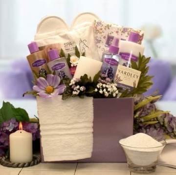 Lavender shows love understanding and gratitude. This beautiful spa treatment set is assembled in a sweet little gift box with lavender flora woven throughout. Filled with an abundance of lavish lavender spa treatments and finished with a lavender bow all we can say is "Perfect" We guarantee she'll love this lavish gift of love and gratitude. Includes a wonderful lavender gift box, Rest & Relax bath pillow, Terry cloth bath slippers, Aromatherapy drawer or room sachet, Yardley lavender soap, Lavender bath gel, Lavender body scrub, Lavender Body lotion, Lavender body spray, micro fiber hand and face towel, decorated with greenery and flowers and topped with a handmade bow.. A true delight. (Of course, this comes in the lavender scent.)