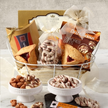 Filled with handfuls of cinnamon-toasted peanuts, a pair of fruit-filled hamantaschen, Honey pretzels dunked in white chocolate then drizzled in dark chocolate, butterscotch sweets, and more.