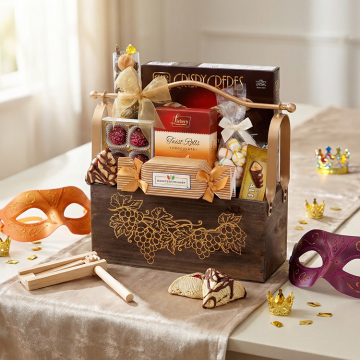 A Purim gift ensconced in a wrought iron and rich oak basket. Enjoy selected chocolate truffles, sweet and succulent treats and crafted flavored filled hamantaschen.