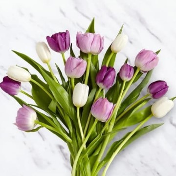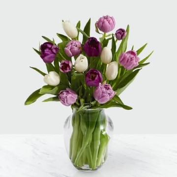 Our Painted Skies Tulip Bouquet will shower them with beauty and color to make this day a moment they will never forget! Our finest pink, purple and white tulips arrive with a clear glass vase to create a bouquet that could only compare to Nature's most miraculous sunsets. The bouquet includes 15 stems and a clear glass vase.