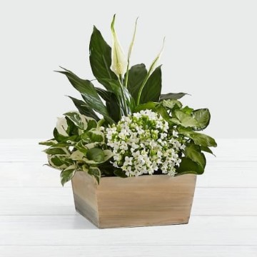 Express warmth to your loved ones with this peaceful garden. Planted full of kalanchoe and lush foliage plants, this garden also comes with one 10"–15" Peace Lily plant. As the Lily blooms your compassion will be conveyed in the most loving way. Container may vary.