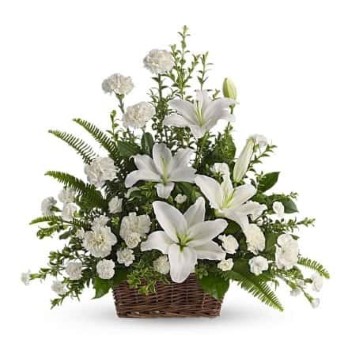 Fresh white oriental lilies and carnations are mixed with rich greens such as salal and oregonia in a natural basket.