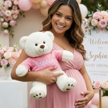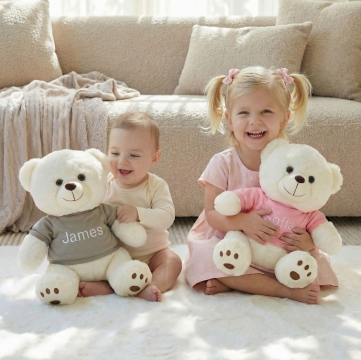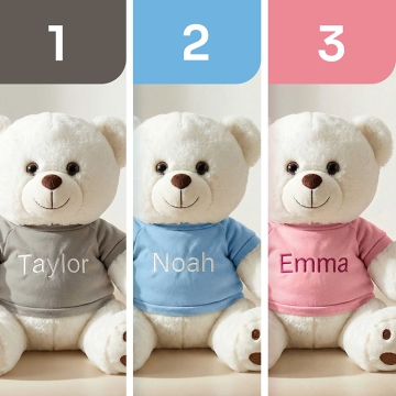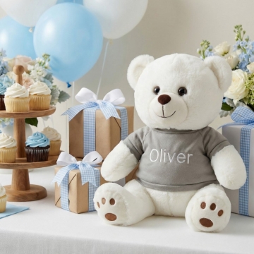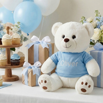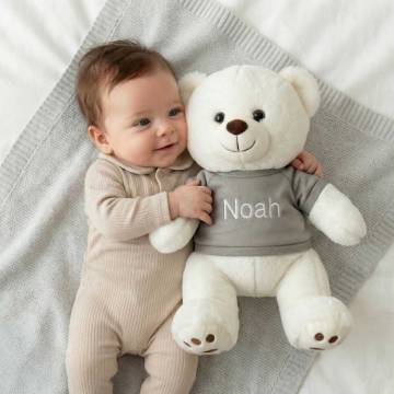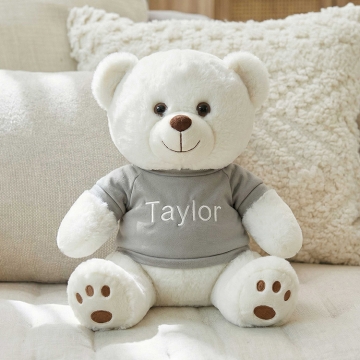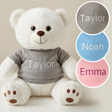 Welcome a precious new arrival with this adorable 13" baby teddy bear, personalized just for them. Dressed in your choice of a blue, pink, or grey t-shirt, each bear is custom embroidered with the baby’s name for a truly special touch. Soft, cuddly, and made to be cherished, this keepsake teddy makes a perfect baby shower gift, newborn welcome, or nursery companion.