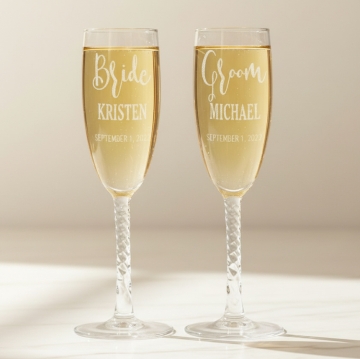 Our Personalized Wedding Champagne Flute Set makes a great gift for any Bride and Groom! Personalized these unique champagne glass with any title, name and wedding date. These set of champagne glasses will make for memorable personalized wedding gifts for the couple!