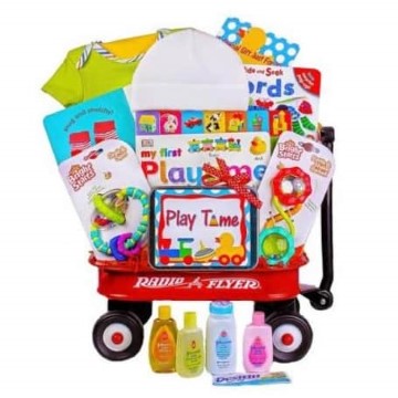 This Radio Flyer wagon captures the essence of fun through play with beaded rattles, educational books and more. What a wonderful way to introduce baby to the colorful world of play. This gift comes wrapped with a ribbon for a bright and cheery presentation.