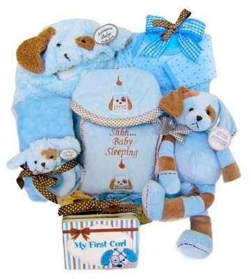 Cuddly and adorable, this large baby boy basket is packed with elegant products for the new baby boy. A super soft puppy coat and matching accessories will surely be the hit of the baby shower.