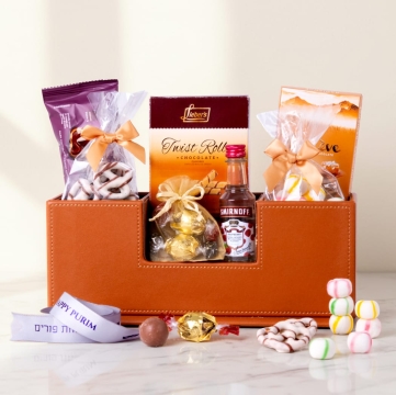 A faux leather desk accessory filled with delectable treats. The perfect gift for friends and associates - L'Chaim!