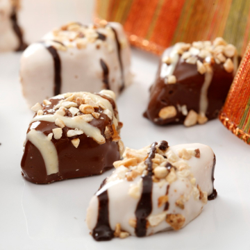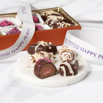 This original Purim wine gift is set in a rectangle wooden tray. Along with an assortment of Fames flavored-filled chocolate truffles are mounds of large roasted and salted almonds, Fames chocolate enrobed crispy bays, handfuls of BBQ seasoned corn nuts, and a bottle of Bordeaux Red Wine wine.