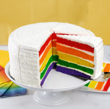 A cake the dessert epicure will die for! Five bright and colorful layers of this delightful cake are perfect for celebrating any happy or festive occasion! We’ve decorated this dessert with a lightly flavored vanilla icing. Perfect for celebrating any happy or festive occasion - for kids and adults alike!
