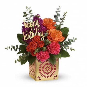 Make their special day sparkle! Surprise them with this beautiful bouquet of orange roses, fuchsia stock, and pink carnations. The luxurious gift is hand-delivered in a shimmering metallic cube with intricate cutouts that later transforms into a gorgeous candleholder!