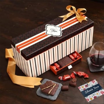 Wish someone a prosperous new year this Rosh Hashanah with a classy wine gift. Nestled in its very own signature win box is a luxury bottle of dry red wine. Celebrate the new year this Rosh Hashanah by raising a glass of dry red wine, paired with Premium Chocolate Truffles and Chocolate Covered Grahams.