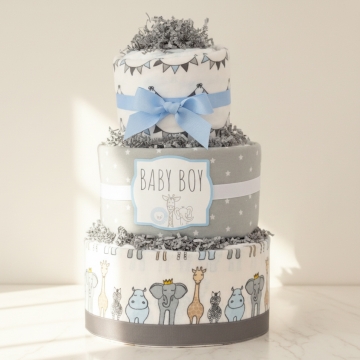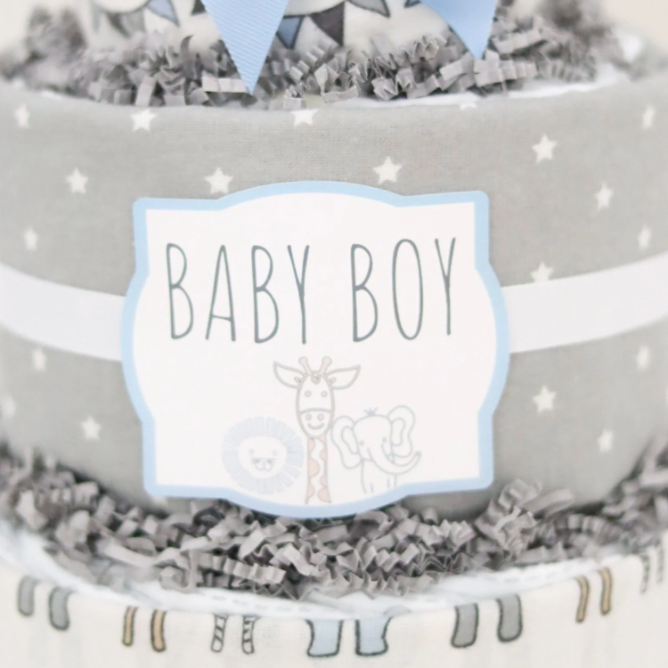 Celebrate the arrival of a little boy with our Royal Safari Diaper Cake . Bursting with 35 ultra-soft Pampers Swaddlers size 2 diapers and three cozy cotton receiving blankets, this delightful creation isn't just a gift—it's a bundle of love and convenience for the new parents. Overflowing with charm and crafted with care, it's the perfect way to welcome the newest addition to the family.