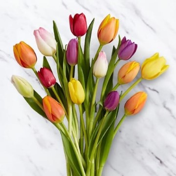 The Rush of Color Assorted Tulip Bouquet will bring a bright splash of color to their special occasion or celebration. 15 Stems of our finest tulips arrive in assorted colors with a FREE glass vase to create a splendid bouquet that will add to the beauty of their day. The bouquet has 15 mixed tulips.