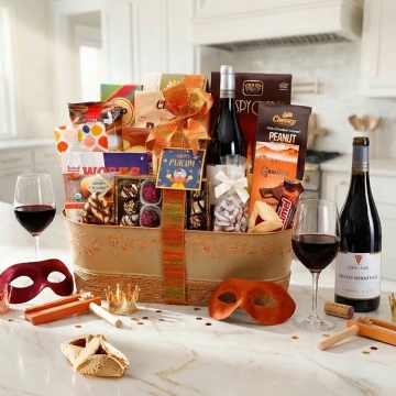 Celebrate Purim with one of our most abundant purim gift baskets, thoughtfully arranged with premium chocolates, gourmet snacks, and a distinguished Northern Rhône Syrah. From berry swirl truffles and chocolate peanut butter bites to BBQ popcorn and honey-dipped pretzels, every detail is curated for a rich and memorable celebration.