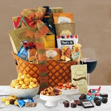 The Rustic Retreat Rioja Red Wine Basket is the perfect gift that is dressed to impress! It makes a grand statement of beauty and bounty upon arrival. Overflowing with sweet and savory snacks and goodies, this gift is perfect for men and for women - especially the wine lover you know!