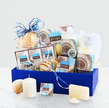 Give a luxurious spa gift of ocean treasures that will soothe and calm them. Just like the peaceful sound of waves lapping on the shore, they will be transported by this lovely gift that includes Ocean Pur shea butter lotion, luxurious bottled hand soap, bar soap, and a box of ocean spa soap.