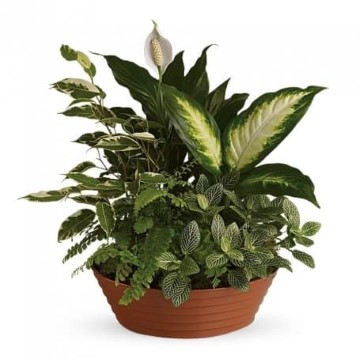 Five hearty green plants, including dieffenbachia, spathiphyllum, white hypoestes, variegated ficus and Boston fern, are gathered into a large, circular plastic dish.