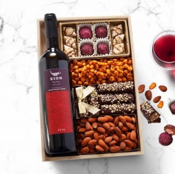 This original Purim wine gift is set in a rectangle wooden tray. Along with an assortment of Fames flavored-filled chocolate truffles are mounds of large roasted and salted almonds, Fames chocolate enrobed crispy bays, handfuls of BBQ seasoned corn nuts and a bottle of Pinot Noir wine.