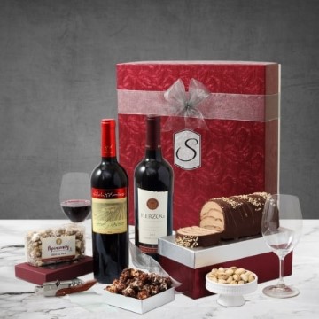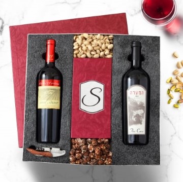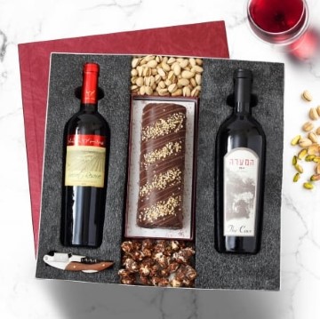 Nestled in our very own Signature Wine box is a selection of the finest in kosher wines. Inspired by legendary vineyards of the Upper Galilee to the southern region of the Judean hills, our offerings will impress the most discerning palate. Included in this gift is a deluxe gourmet chocolate enrobed halva log (10") drizzled with extra creamy chocolate, cashew crunch, mounds of seasoned pistachios, Popinsanity Rocky Road popcorn and a premium wooden corkscrew.