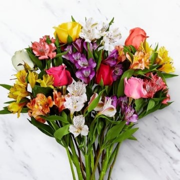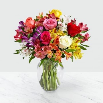 Send a sunny splash of color and brighten their day with this vibrant bouquet of 10 Peruvian lilies, mixed with 6 multi-colored roses. Symbolic of friendship and devotion, each stem of Peruvian lily has multiple blooms and is sure to warm their heart.