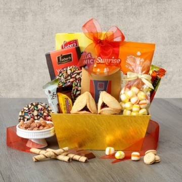 Dazzle friends and family with this fun-filled Purim Shalach Manos! This gift basket is stuffed with an abundance of delightful, entertaining, and satisfying treats. Includes a pair of fruit-filled hamantash, sesame toasted peanuts, s jumbo chocolate drizzled sprinkle cookie, wafer rolls, and much more!