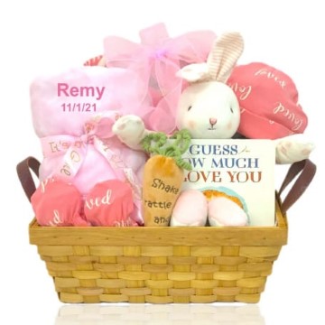 A Bunny Basket that can be personalized and includes Some Bunnies By The Bay items as well as Organic clothing for Baby.