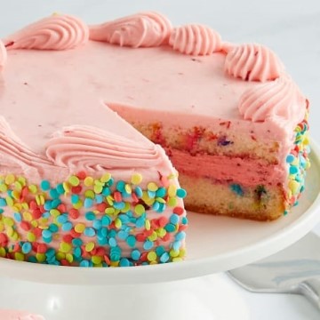 Our delectable strawberry cake has evolved into a party monster! We take two layers of yummy confetti cake and sandwich a scrumptious blend of strawberry filling and frosting; then we finish the cake with more strawberry frosting and confetti sprinkles on the side. A sure hit for fruit lovers all-over.