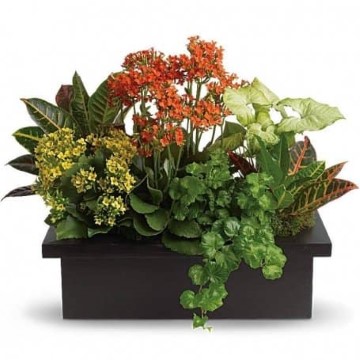 A modern way to send mixed plants! This colorful, long-lasting gift is presented in a dark vase with clean lines, making it a perfect pick for the home or office. Also an excellent get-well gift!