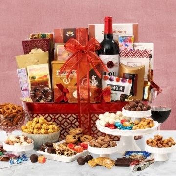 One of our grandest gifts yet, the Supreme Splendor Holiday Wine Basket showers your loved one with an incredible array of sweets, treats, snacks and more. From silky smooth gourmet chocolates to ooey-gooey creamy caramels, from healthy dried fruits and nuts to perfectly puffed pastry and popcorn, it has every savory and sweet flavor to please even the most distinguishing of palates. In addition to our phenomenal selection of gourmet snacks, we have selected a delightful red wine to accompany the experience. Perfect for the holiday season, whether for Christmas, Hanukkah, or any seasonal celebration that calls for a grand gift.