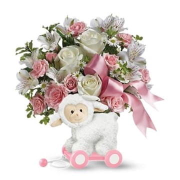 Baby had a little lamb! This charming special delivery is really two gifts in one: a gorgeous rose bouquet for the new parents, and a delightful keepsake to decorate the baby's nursery! Our exclusive whimsical wooden lamb is covered in soft fleece and filled with beautiful blooms for a precious present they'll always remember!