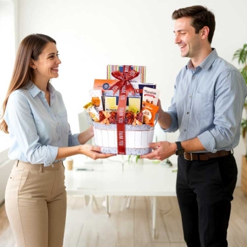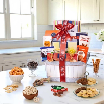 This gourmet thank you gift basket is packed with delights like Dilettante chocolate truffles, Almond Roca butter brunch, butter toffee popcorn, cinnamon yogurt pretzel twists, Walkers cookies, lemon blueberry cookies, hazelnut wafer rolls, and more. Thoughtfully curated by Broadway Basketeers, it’s the perfect gift for expressing your appriciation.