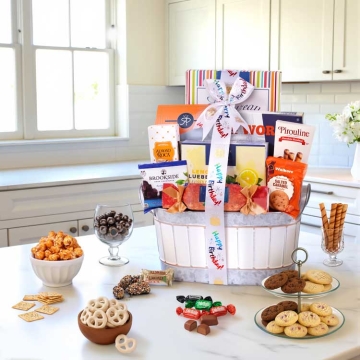 This birthday gourmet gift basket is packed with delights like Dilettante chocolate truffles, Almond Roca butter brunch, butter toffee popcorn, cinnamon yogurt pretzel twists, Walkers cookies, lemon blueberry cookies, hazelnut wafer rolls, and more. Thoughtfully curated by Broadway Basketeers, it’s the perfect gift for brightening thier birthday.