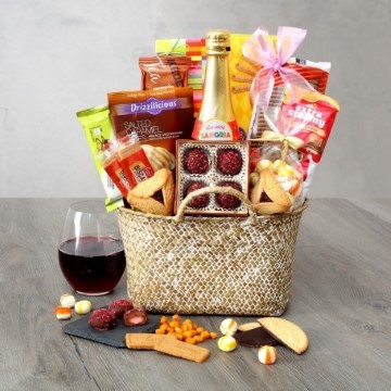 Sweet succulent and bursting with flavor, this gift basket is brimming with your Happy Purim wishes. Filled with premium chocolate truffles, BBQ corn nuggets, Drizzleicious rice bites, fruit-filled hamantashen & much more!