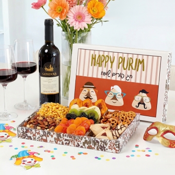 This gourmet Purim gift tray will truly enhance any Purim table. Along with a bottle of Viniferia Cabernet Sauvignon Wine comes a dried fruit selection of luscious dried fruits and nuts including, dried peaches, apricots, apples, a trio of fruit-filled hamantashen, sweet and savory snack mix, roasted corn nuggets, and very berry trail mix! A truly spiritual experience