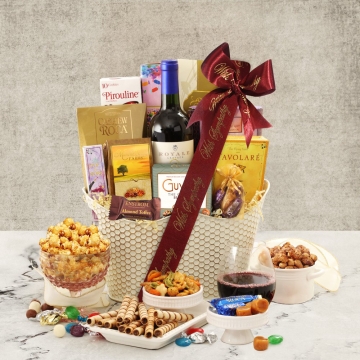 The Sympathy Wine Gift Basket contains an assortment of comforting snacks and sweets along with a bottle of merlot wine that your recipient will enjoy.