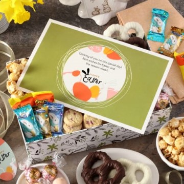Let your recipient know that you are thinking of them with an assortment of tasty gourmet treats. This floral box is filled to the brim with Reese’s Chocolate Peanut Butter Easter Eggs, Ghirardelli Chocolate Bunnies, Gourmet Caramel Popcorn, Lindt Chocolate Truffles, and many more delicious Easter treats.