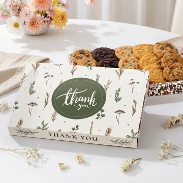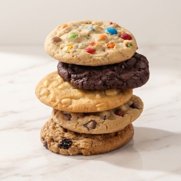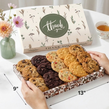 Send a scrumptious thank-you gift with this gourmet assortment of large, freshly baked soft cookies. Flavors include chocolate-chocolate chip, oatmeal raisin, white chocolate macadamia, M&M cookie, & classic chocolate chip.