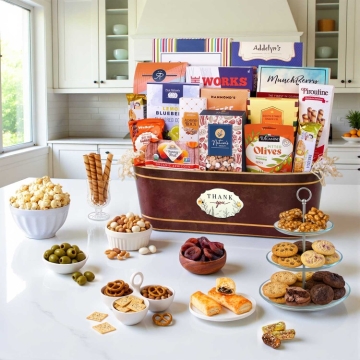 Express your sincere gratitude with an elegant gift basket that is filled with delectable treats. This unique signature gift basket is filled with gourmet popcorn, sweets, and tasty treats that your recipient is sure to enjoy.