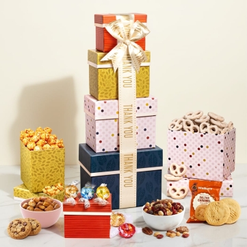 Indulge in a symphony of flavors with our Gourmet Gift Tower, the perfect thank-you gesture. Elevate their snacking experience with a selection of artisanal treats, from savory snacks to decadent treats, meticulously curated to delight every palate. Make their day extraordinary with this elegant tower of gourmet delights.