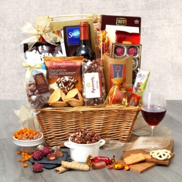 Share your wishes with this lavish and bountiful gift basket for all to enjoy. Festooned with Popinsanity Rocky Road popcorn, Cabernet Sauvignon Wine, Pardes chocolate truffles, milk butter toffee and more!