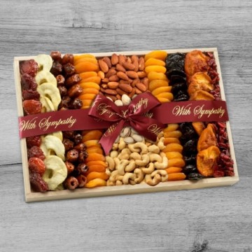 This gourmet dried fruit & nut gift tray is filled with a large assortment of luscious dried fruits and nuts including, dried plums, peaches, dates, apples, cashews, roasted and salted almonds and more! A great healthy condolence gift.