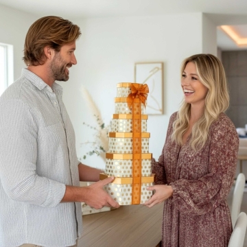Indulge your cravings this holiday season with this gorgeous gourmet gift tower. A great gift choice for the merry ones in your life, this stunning box set of goodies is sure to delight one and all. Wrapped in beautiful boxes and topped with a bow, this sweet treat tower creates an easy way to display these tasty offerings for office parties, family gatherings, and everywhere in between.